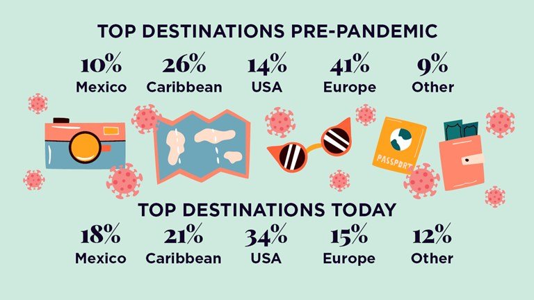 Antes da pandemia, os assessores dizem que seus principais destinos incluíram Europa (41%), Caribe (26%), Estados Unidos (14%) e México (10%). Atualmente, os consultores estão vendendo para os EUA (34%), Caribe (21%), México (18%) e Europa (15%).
