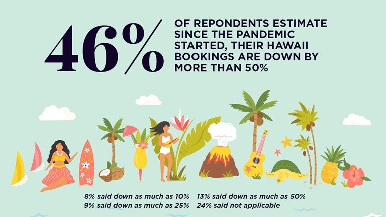 Outro destino popular que foi afetado pela pandemia é o Havaí. Mais de dois terços (67%) dos conselheiros relatam que tiveram que cancelar viagens ao Havaí. Além disso, muitos consultores (46%) dizem que seus negócios no Havaí caíram mais da metade; outros 13% dizem que diminuiu entre um quarto e meio; e 9% dizem que caiu entre 10% e 25%. Apenas 8% dos entrevistados indicam que seus negócios no Havaí caíram menos de 10%.