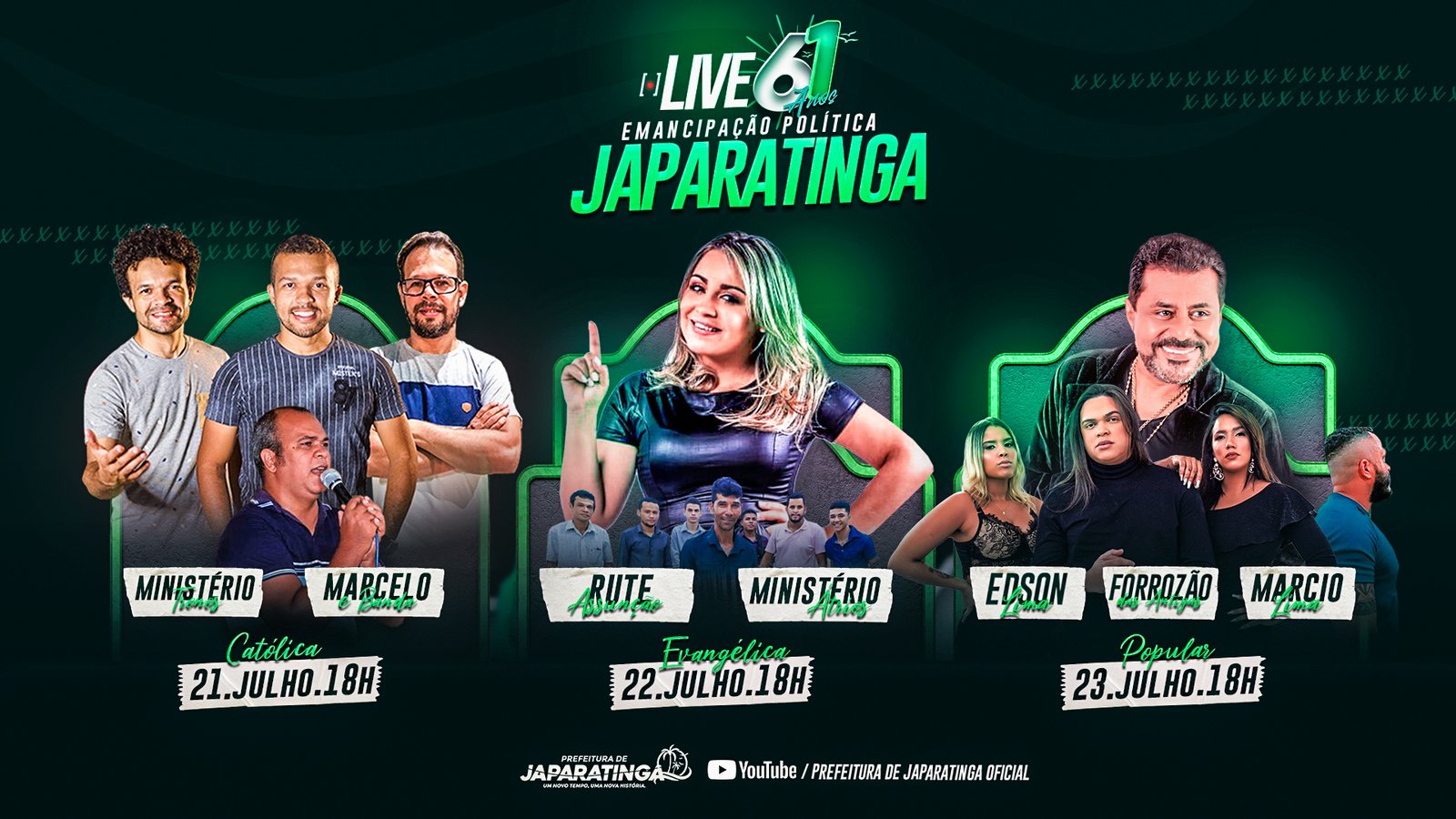 A Prefeitura de Japaratinga vai celebrar os 61 anos de emancipação política com programação online. Por causa da pandemia os shows católico, evangélico e popular serão transmitidos nos dias 21, 22 e 23 de julho, respectivamente, a partir das 18h, no canal do governo municipal, no youtube: youtube.com/prefeituradejaparatingaofical.
