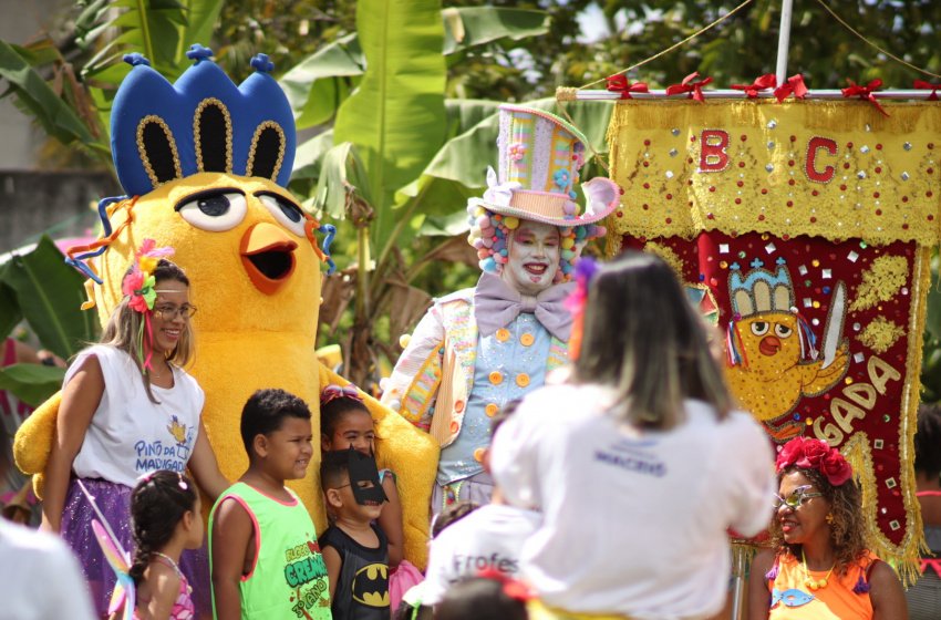 Com muito frevo, o mascote do maior bloco carnavalesco de Alagoas, o Pinto da Madrugada, encantou a festa de momo dos estudantes da rede pública municipal de ensino, na manhã da quarta-feira (8).