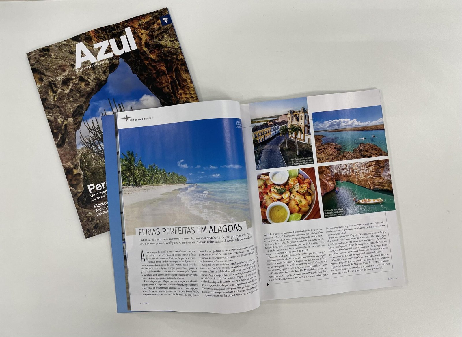 Já com a Azul Viagens, o Governo de Alagoas realiza ações como a revista de bordo deste mês de fevereiro, que traz uma reportagem de página dupla com as belezas, os atrativos e os diferenciais do estado. Em um texto envolvente, os jornalistas dão detalhes da rica experiência de férias por terras alagoanas. Com a operadora, as belezas das praias ainda estarão na TV de bordo, em displays pelo Aeroporto de Viracopos, em Campinas (SP), em projeções visuais, ônibus plotados, entre outras ações.