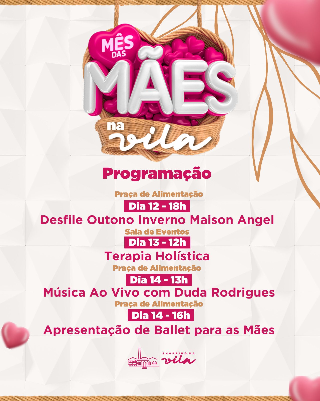 O Shopping da Vila está com uma programação incrível para celebrar o Dia das Mães. Maio é o mês delas e o shopping preparou diversas atrações para as mães e suas famílias. Além disso, as lojas do shopping também estão com promoções especiais para os clientes aproveitarem.