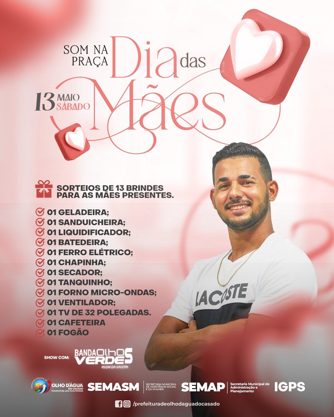 A Prefeitura de Olho d’Água do Casado, administração Zé da Emater, irá realizar neste sábado, 13, o Som na Praça com show da banda Olhos Verdes e sorteio de brindes para a comemoração do Dia das Mães.