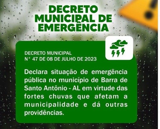 A Prefeitura da Barra de Santo Antônio declara estado de emergência em decorrência das intensas chuvas registradas no município nos dias 07 e 08 de julho de 2023, que resultaram em significativos prejuízos para a população. A Prefeita Lívia Carla emitiu o decreto nº 47 neste sábado (08).