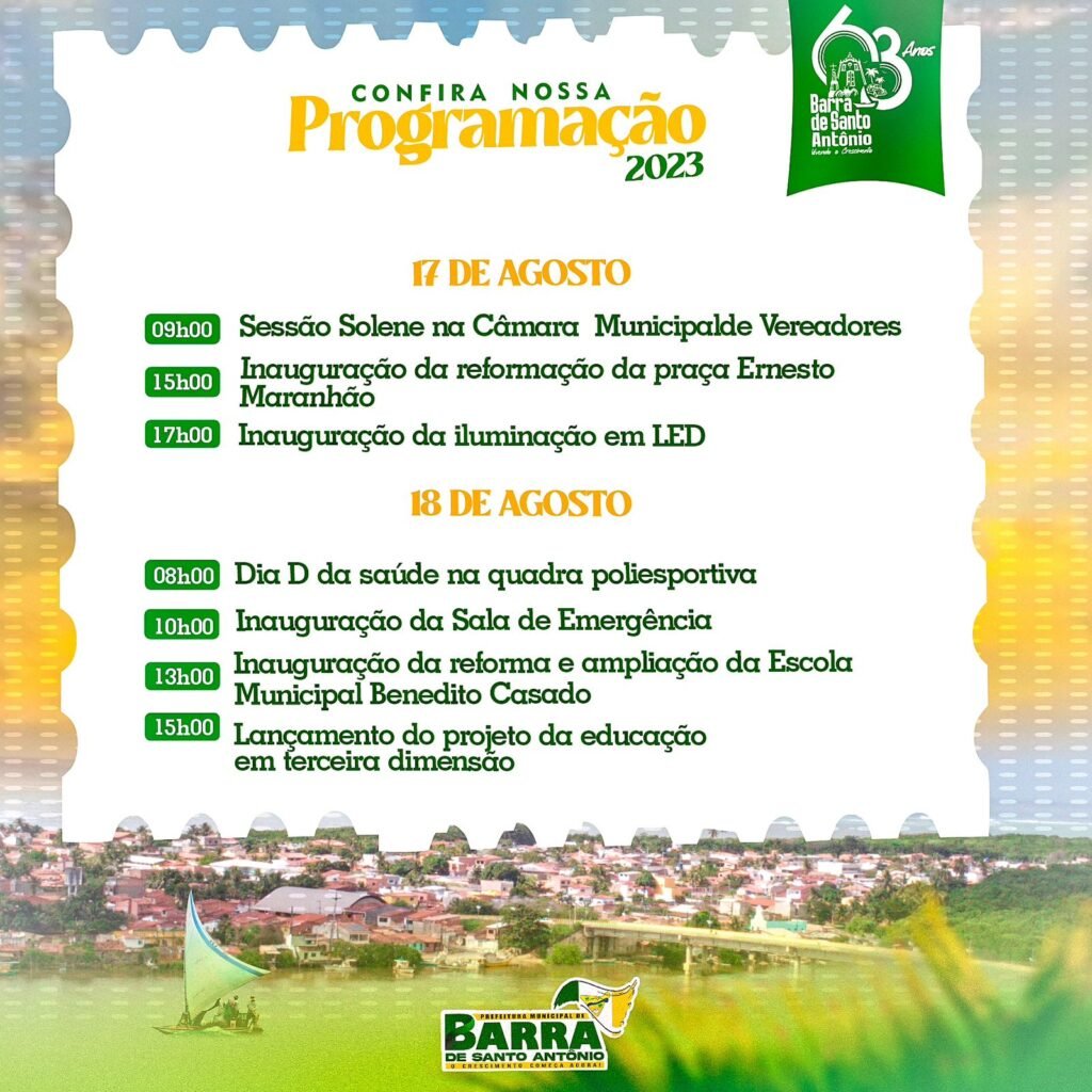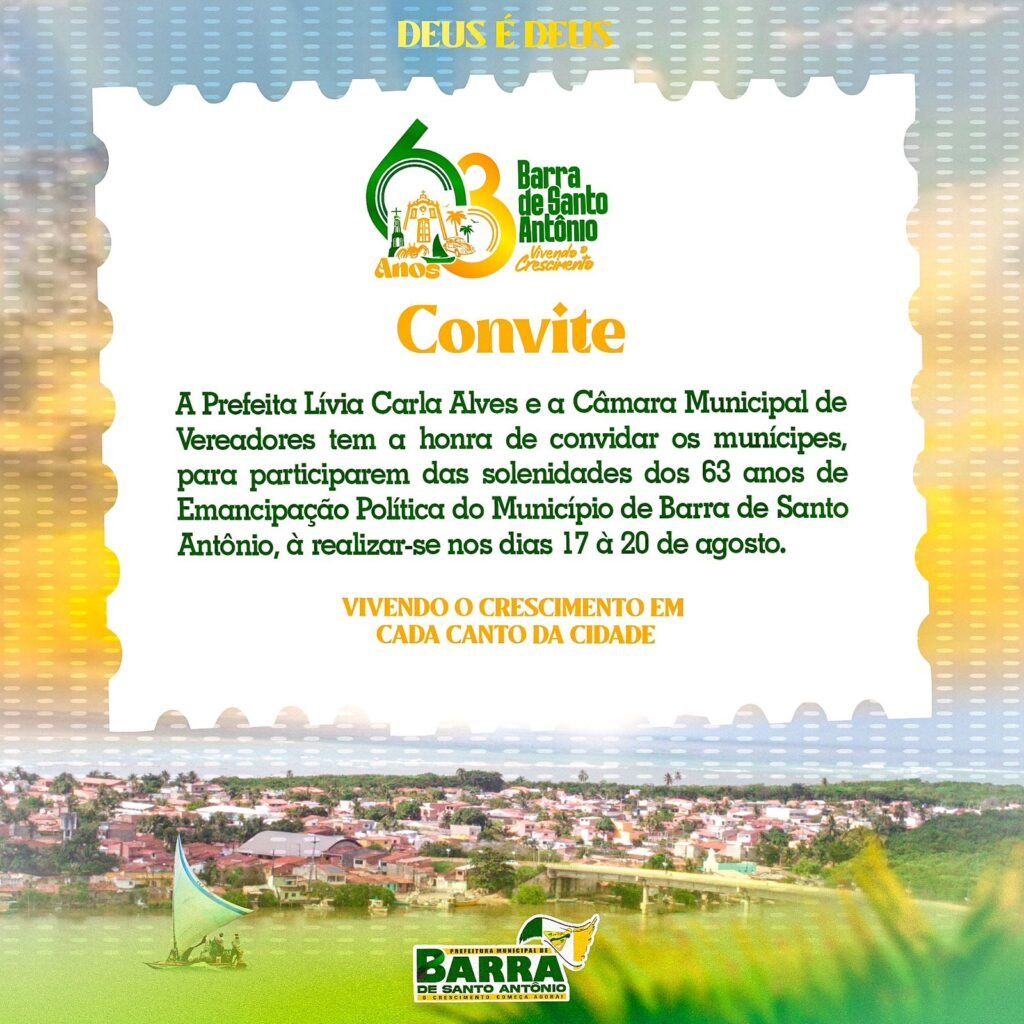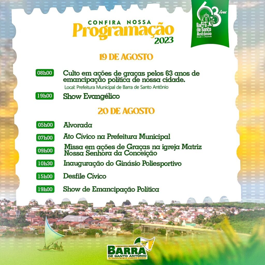 No próximo domingo, 20 de agosto, a Barra de Santo Antônio estará completando 63 anos desde a sua Emancipação Política, marcando este marco histórico sob a liderança de uma incansável mulher à frente da gestão, prefeita, Lívia Carla. Mesmo diante dos desafios impostos pelas adversidades climáticas que impactaram o município, a data será celebrada com uma série de realizações e projetos que abrangem toda a cidade.