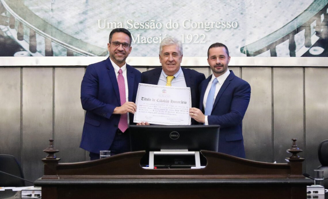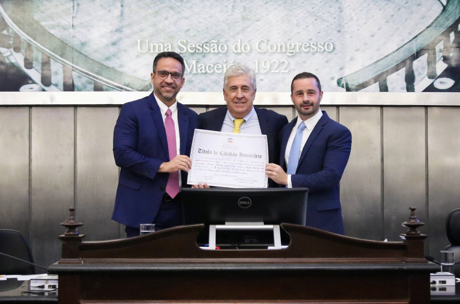 O governador Paulo Dantas participou, nesta quinta-feira (28), da sessão solene na Assembleia Legislativa (ALE) que concedeu o título de Cidadão Honorário de Alagoas ao empresário português Jorge Rebelo, presidente do Conselho de Administração da Rede de Resorts Vila Galé. O grupo, responsável pela gestão de 41 unidades hoteleiras no Brasil e no mundo, em junho do ano passado, inaugurou uma unidade na Barra de Santo Antônio, no Litoral Norte do Estado, gerando 500 empregos diretos e mais de dois mil indiretos, com desenvolvimento sustentável no setor turístico alagoano e fomentando inúmeros benefícios.