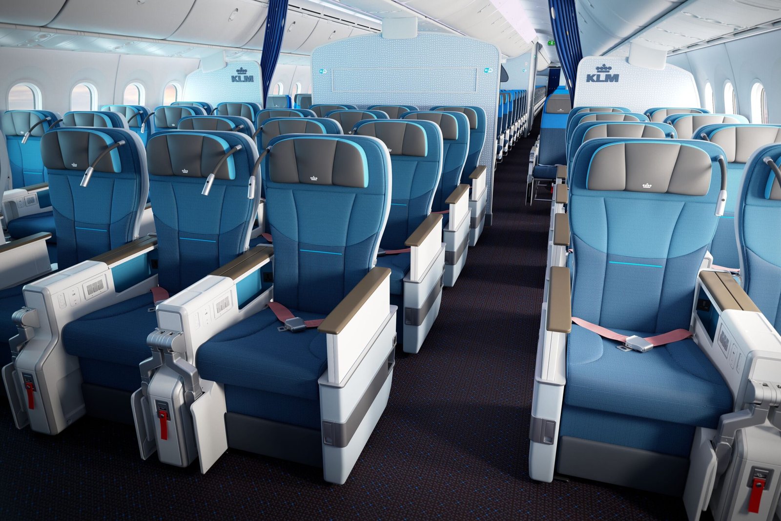 Os novos assentos na classe Premium Comfort foram projetados pela Collins Aerospace em conjunto com especialistas da KLM Customer Experience. Além de seu design elegante e características de conforto, os assentos também são mais leves do que os designs anteriores. Um cuidado semelhante foi tomado na seleção de materiais de catering para a categoria: talheres especiais, tigelas e pratos, feitos de polipropileno leve, são reutilizáveis. Os demais utensílios são feitos de PEF reciclado. Todos os materiais foram cuidadosamente avaliados em termos de reutilização e peso, sem prejudicar as características estéticas.
