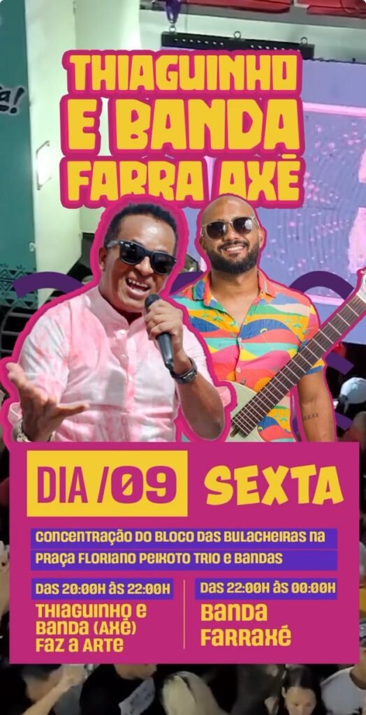 Já no dia 09, sexta-feira de Carnaval, os blocos “Os corujões” e “As bolacheiras” vão abrir a noite de festa. A concentração acontece na Praça Floriano Peixoto, em frente a sede da Prefeitura Municipal, onde Thiago Coimbra e a banda Farraxé vão animar a multidão a partir das 22h. No dia seguinte, será a vez da irreverência da banda Trio da Huanna, cujo trio vai partir, às 17h, da Praça Rubens Canuto com destino ao corredor da folia, na orla lagunar – onde a escola de samba Gaviões da Pajuçara também vai se apresentar, divulgando o samba-enredo intitulado ‘Pilar decolou’.