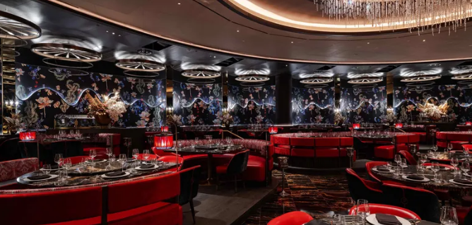Os clientes podem pedir um “Beefcase”, uma machadinha wagyu australiana, trazida pela primeira vez à mesa crua em uma caixa de ouro com diamantes. A carne é marcada em meio a uma apresentação de luzes, música e fumaça, depois cozida na cozinha e banhada.