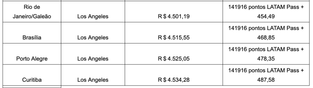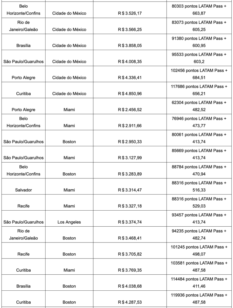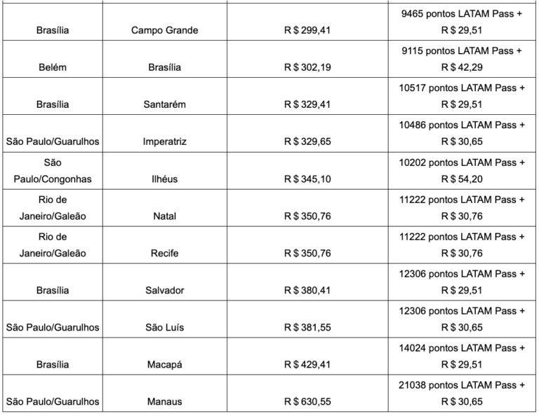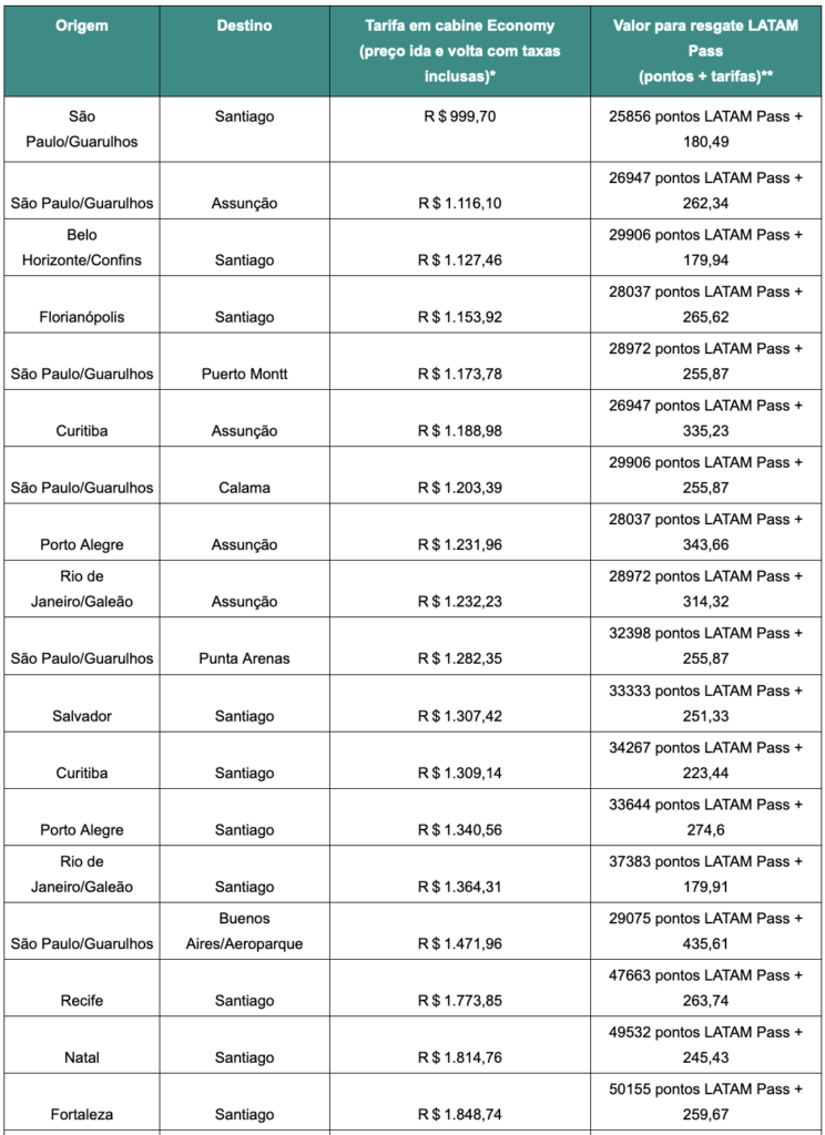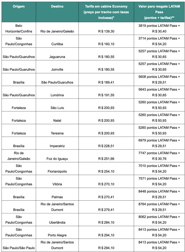 Veja tabela abaixo com os trechos na promoção: