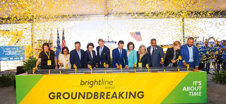 O secretário do Departamento de Transportes, Pete Buttigieg, juntou-se aos executivos da Brightline West e funcionários do governo local para a cerimônia oficial de inauguração realizada na futura estação ferroviária Brightline West em Las Vegas.