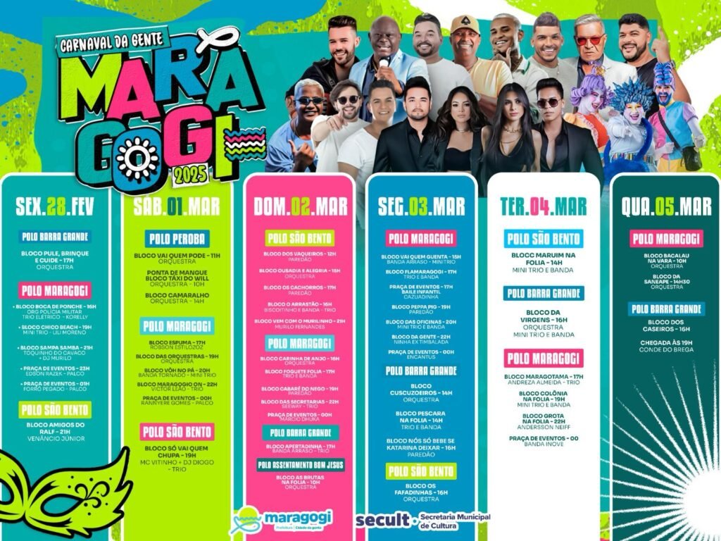A Prefeitura de Maragogi, por meio da Secretaria Municipal de Cultura, Esporte e Eventos, promete um Carnaval histórico em 2025. A programação já teve início nesta quinta-feira (27) e seguirá até a quarta-feira de cinzas (05).