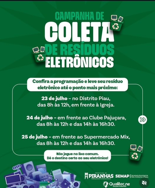 A Prefeitura de Piranhas, por meio da Secretaria de Meio Ambiente e Pesca, convida você para participar da Campanha de Coleta de Resíduos Eletrônicos. Piranhas é um dos poucos municípios do Sertão que realiza a coleta seletiva do chamado lixo eletrônico, que tem se transformado em uma fonte de renda para quem recolhe. Empresas especializadas retiram do lixo eletrônico componentes valiosos.