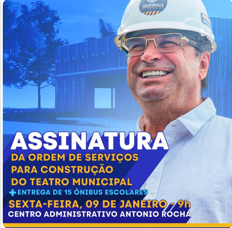 “Arapiraca merece, seu povo merece e os amantes da arte e da cultura se sentirão em uma cidade que olha para o futuro em todas as dimensões. Deus abençoe nossa Arapiraca, Deus abençoe a nossa gente. Agradeço ao deputado federal Daniel Barbosa por ter colocado 11 milhões de reais para não faltar recursos na construção dessa obra magnífica”, destacou o chefe do Executivo em rede social.