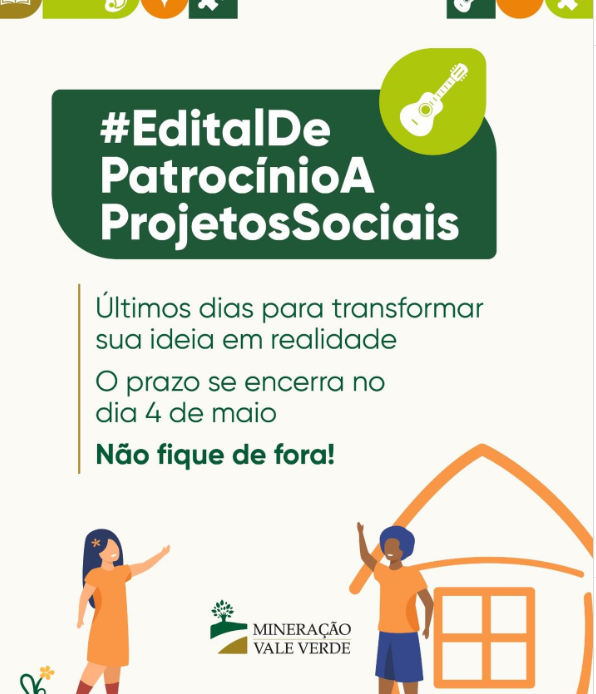 A Mineração Vale Verde (MVV) informa que as inscrições para o edital de Patrocínio a Projetos Sociais seguem abertas apenas até a próxima segunda-feira, dia 04 de maio.